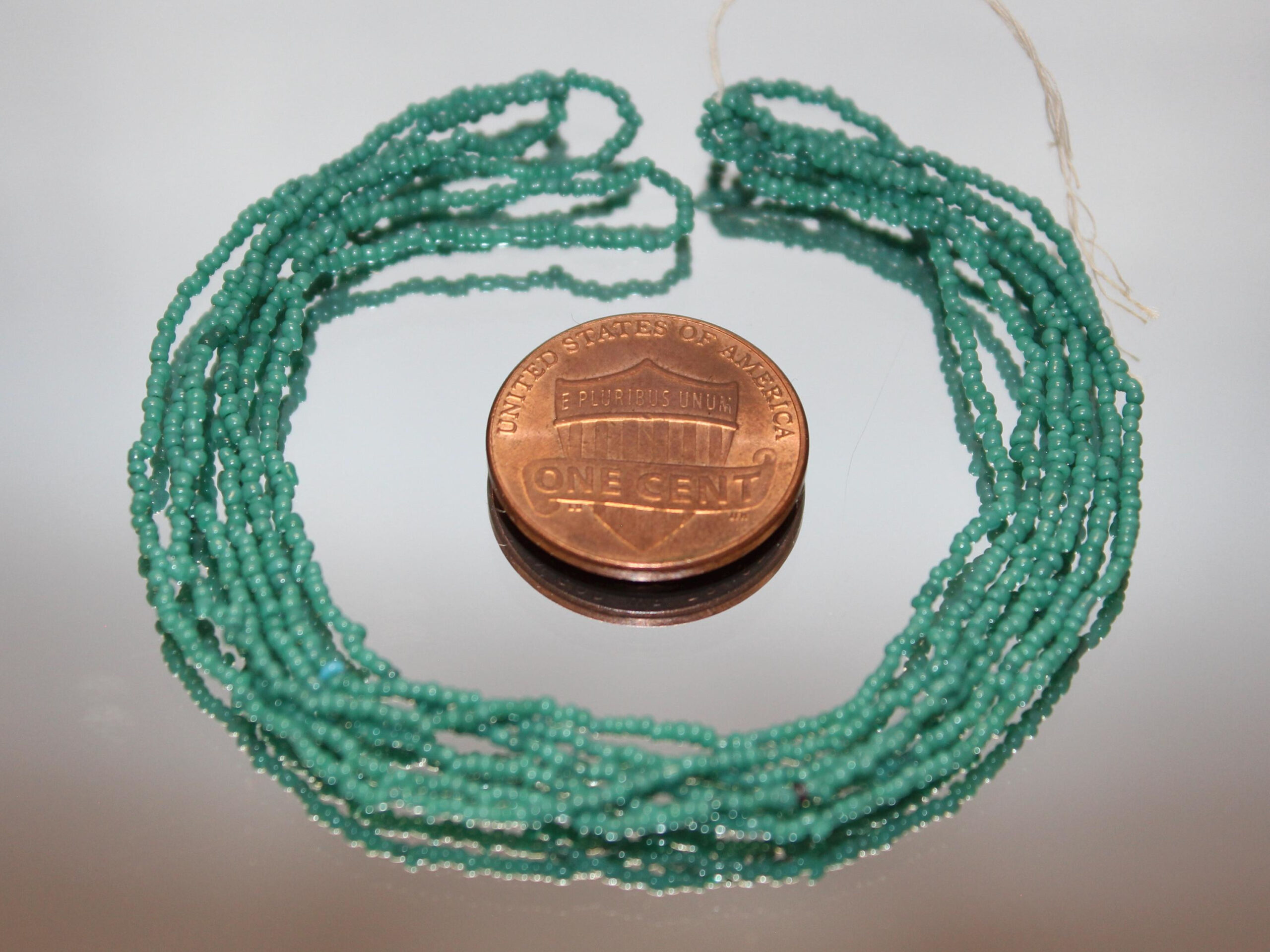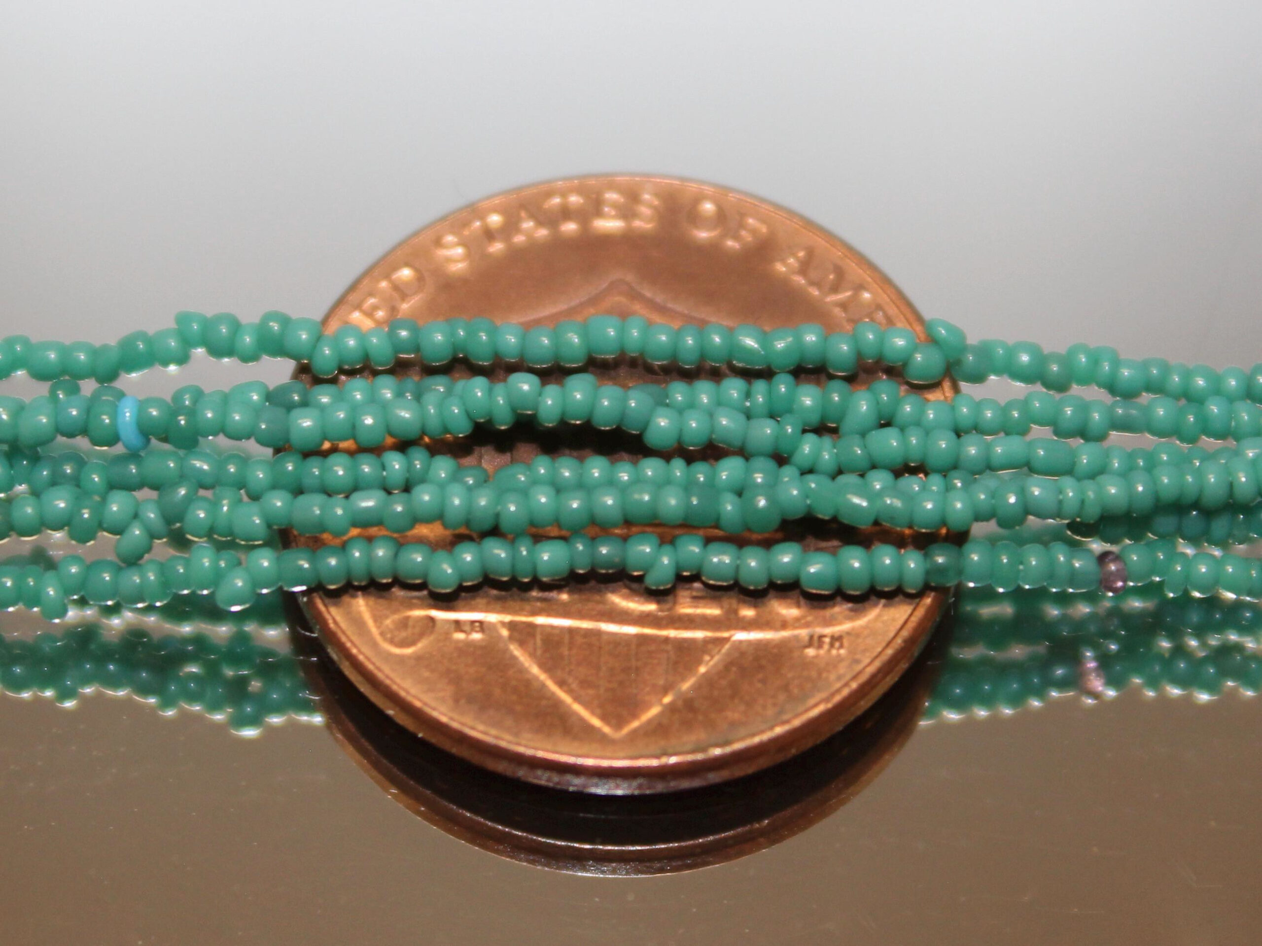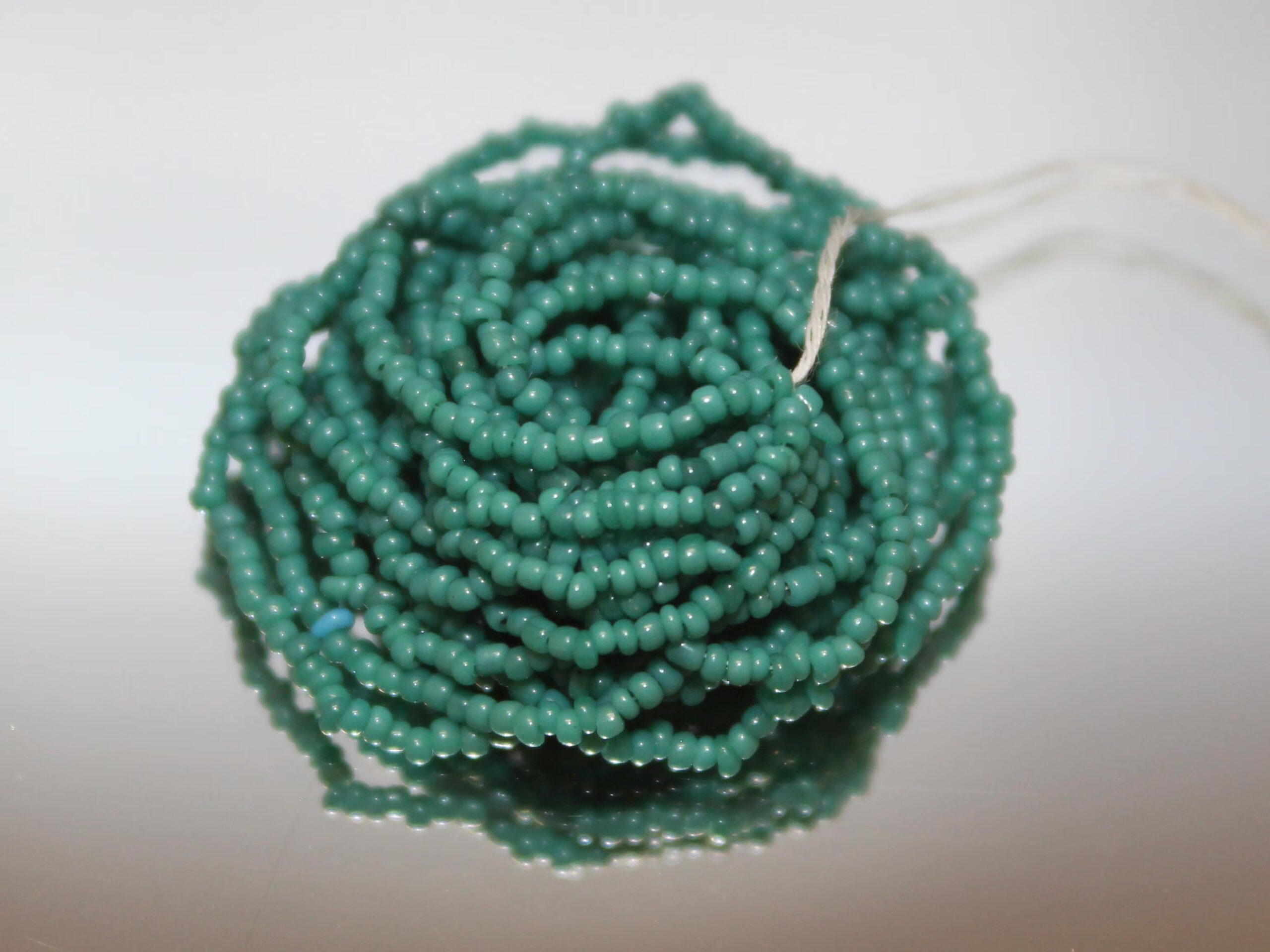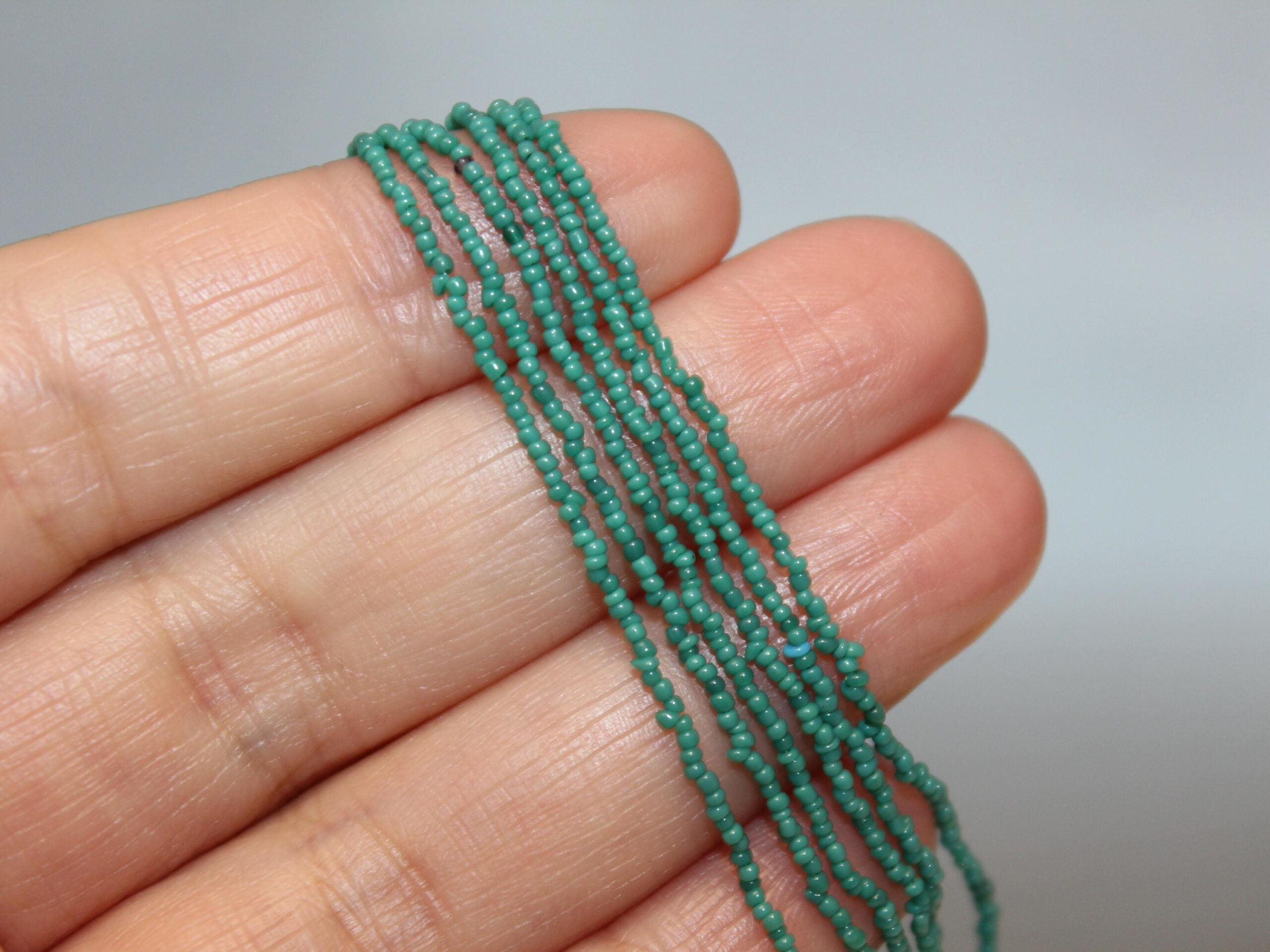 These 18/0 Vintage Micros were made in the 20’s in Italy. Excellent for repairing antique beaded purses or create your own wildest design with vintage micro beads. If you are crazy enough, these are workable into exotic micro jewelry! This color is close to Arapaho Green. It also sometimes called Blue-Green.