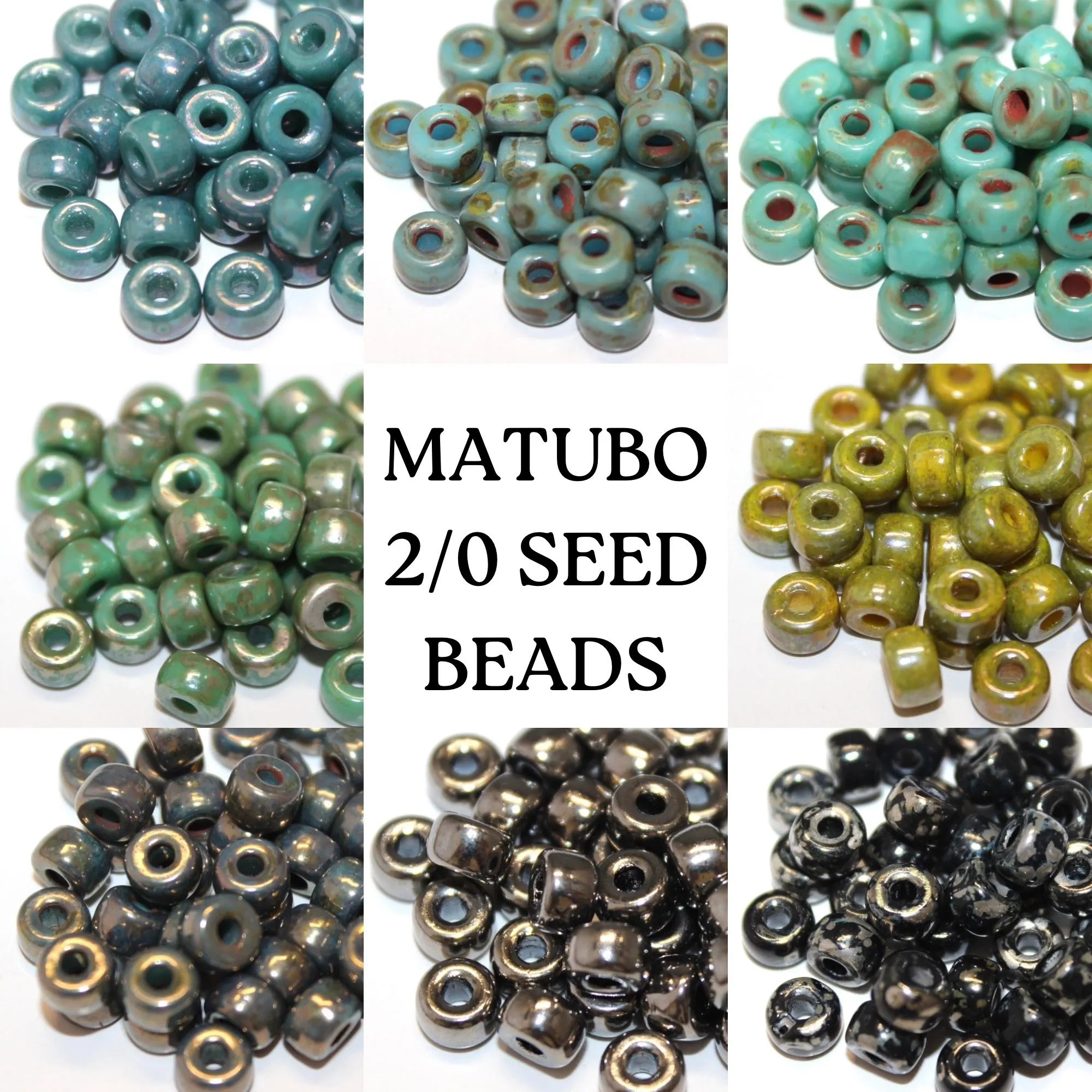 Beautiful color selection of size 2/0 Matubo Czech glass seed beads. These beads measure 6.1mm and have a 1.6mm hole. We are selling them by the 10 gram bag (approximately 46 beads).