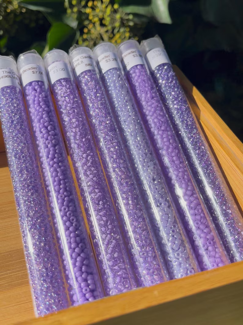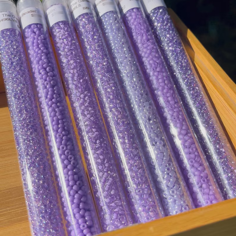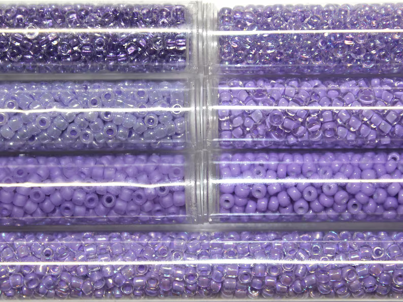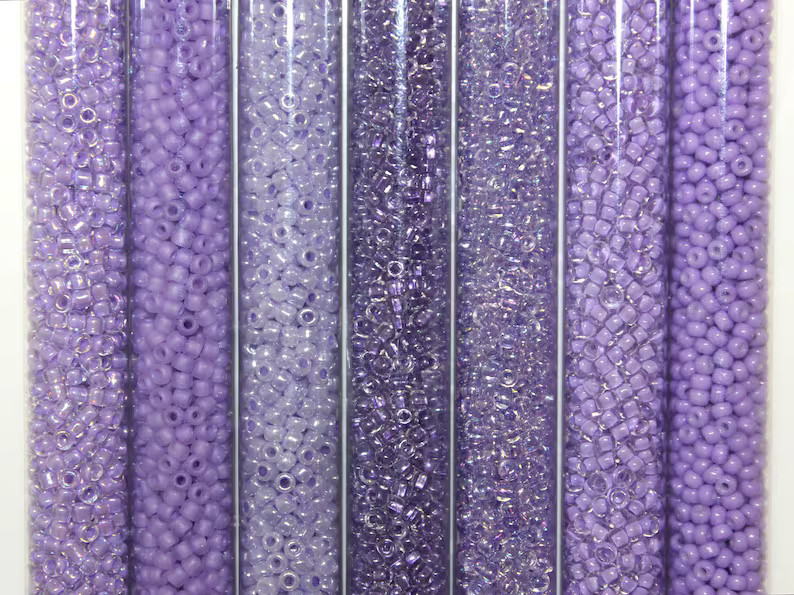 Beautiful variety pack of purple colors that work collectively well together. This pack includes 7 colors. You will receive one 1 ounce tube of each color. Size 8/0 is 3mm in diameter with a 1.1mm hole. (Medium) 1 ounce(28.4grams) is approximately 1,050 beads.