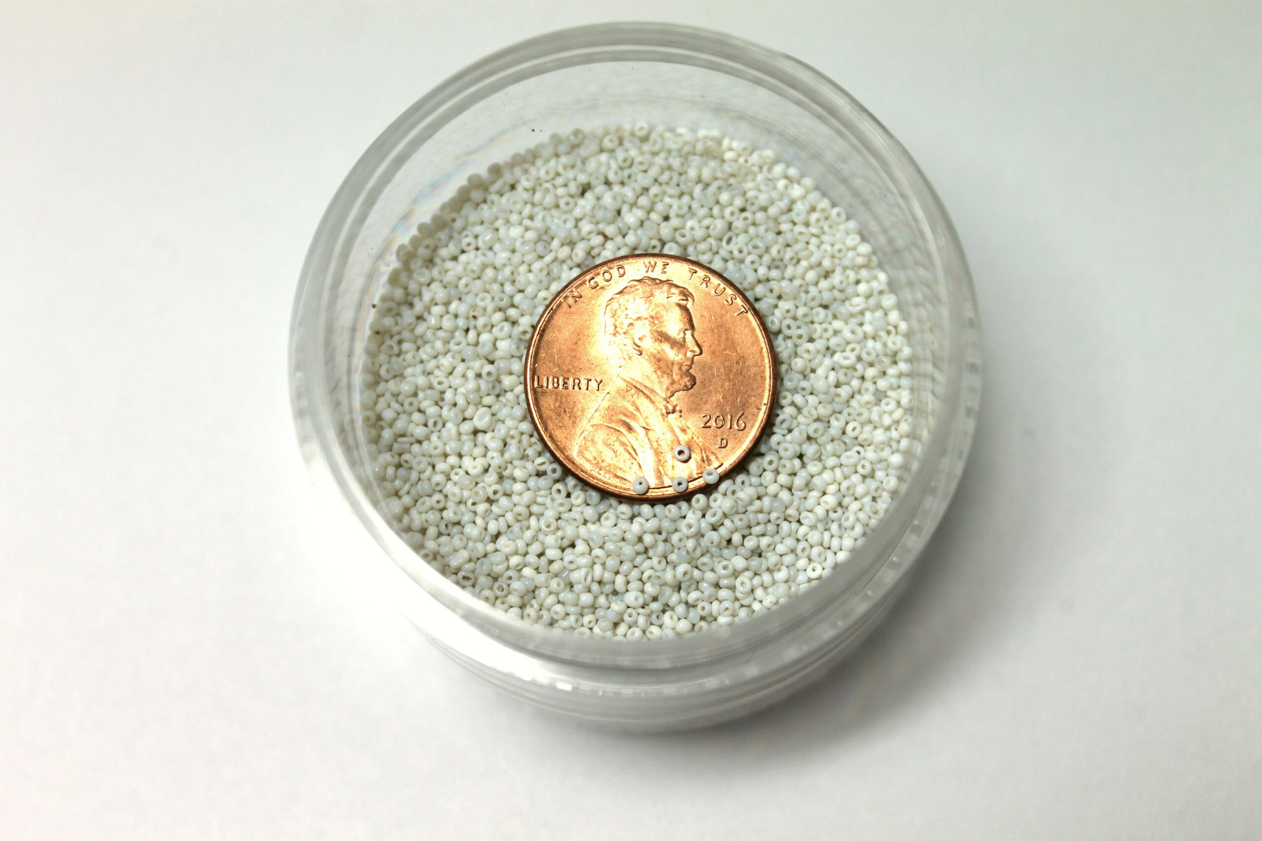 These beads measure about 1.2mm, there are approximately 30 beads per inch. These beads are sold in a 3 inch tube which is 15 grams, about 13,650 beads.